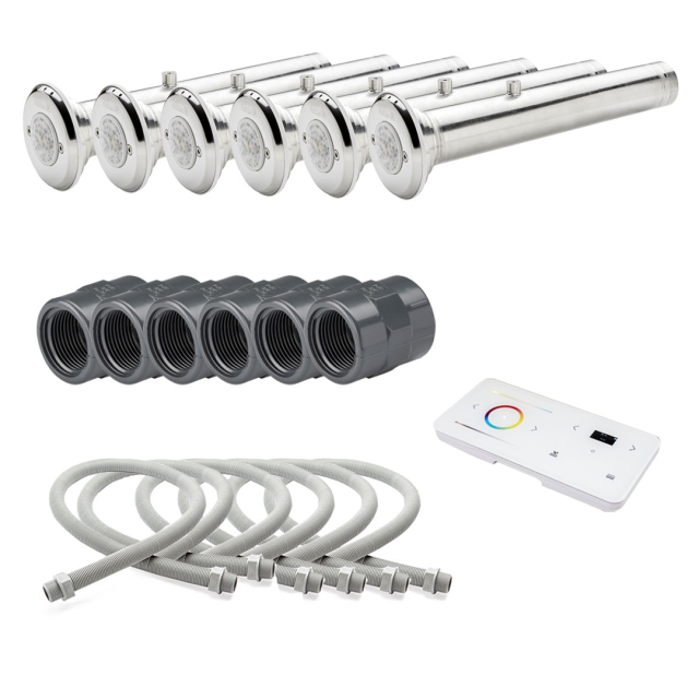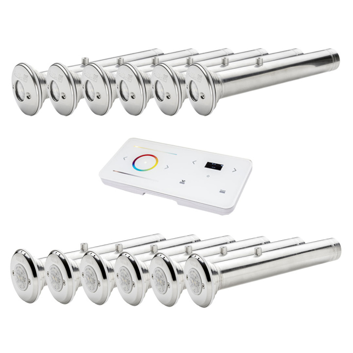 Spotlights ideala för belysning i spabad, pooltrappor, fontäner eller som spotlights i poolen. Tillverkade i rostfritt syrafast stål med högglanspolerad front. Levereras i en komplett enhet. RGB är dimbara.