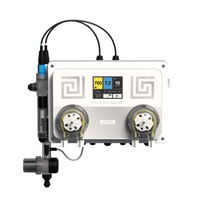 ASIN AQUA Salt NET är en smart saltvattensklorinator som håller koll på vattnets värden. Utöver saltcell och doserpump för pH finns också en pump för flockningsmedel eller algbekämpningsmedel. Även ASIN AQUA Salt Net kan övervakas via Aseko Live direkt i telefonen.