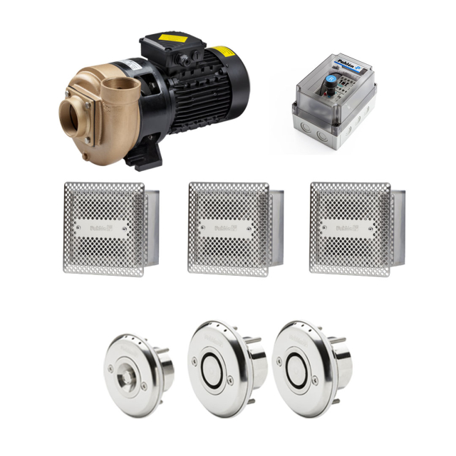 Paket med 2 st massagemunstycken Classic, 1 st FloVISE pump, kontrollbox, startknapp, vägg- och bottenutlopp. I paket för tjock vägg ingår även ingjutningsrör.
